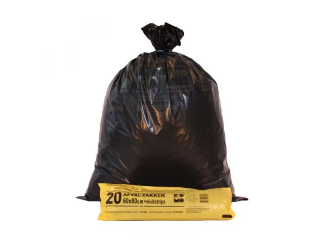 De gecertificeerde afvalzak van gecontroleerde kwaliteit is gemaakt van gebruikt plastic. Met een formaat van 60 x 80 cm en een volume van 60 liter is deze KOMO-huisvuilzak geschikt voor de meeste afvalbakken en voor vele soorten afval.