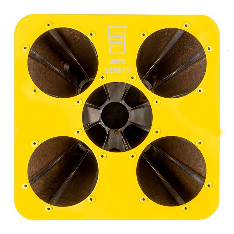 De afvalscheidingsunit heeft een scharnierend deksel en is voorzien van een aluminium bekerinzet met gekleurde (geel) aluminium plaat met 5 gaten (openingen Ø 8 cm). Recycling stickers om de verschillende afvalstromen duidelijk te maken worden meegeleverd. De geïntegreerde zakhoudbeugels zorgen ervoor dat de afvalzak eenvoudig te klemmen is. Door het buizenframe van de bekerinzet worden de weggegooide bekers automatisch efficiënt gestapeld waardoor er meer bekers in de bekerbak passen. Optioneel is er een kunststof schroevenset (AF176) beschikbaar om meerdere bakken te koppelen tot afvalscheidingsstation.