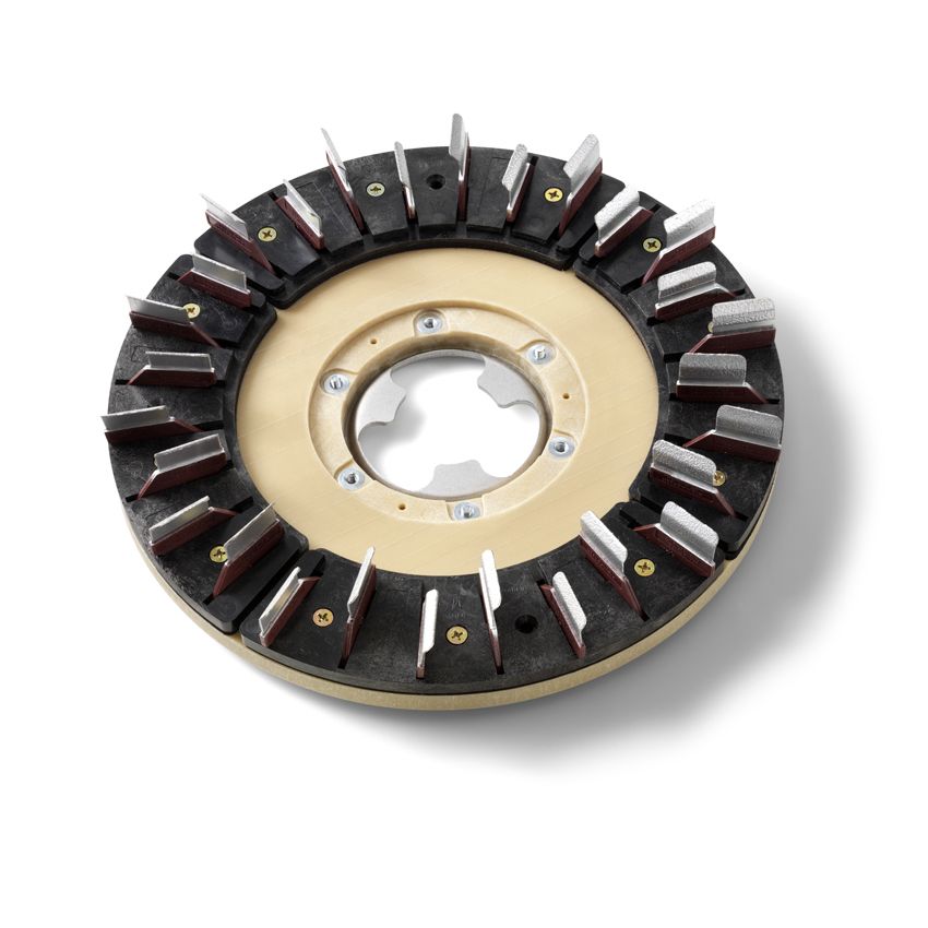 Het Diamabrush by Malish beton- en Terrazzo-vloerpolijstsysteem is afhankelijk van het gebruik van de steeds fijner wordende polymeer inzetstukken. Elk betonpolijstgereedschap bevat flexibele bladen waarmee de diamanten constant in contact blijven met de vloer.