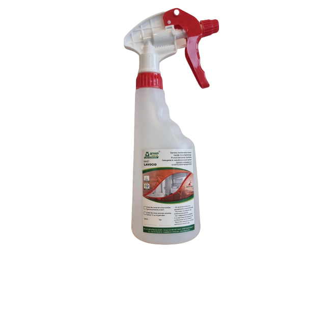600 ml sprayflacon met rode Ergo spraytrigger en vinyl etiket, geschikt voor gebruik met Sanet Lavocid.