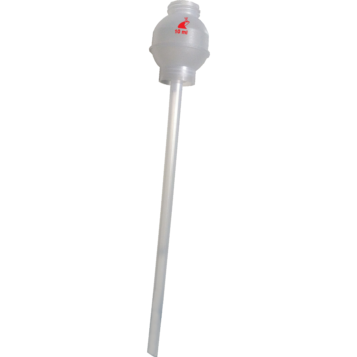 - Door een simpele druk op de fles vult de doseerkamer zich, het overbodige product loopt terug in de fles via de aanzuigslang tot precies 5ml/10ml.