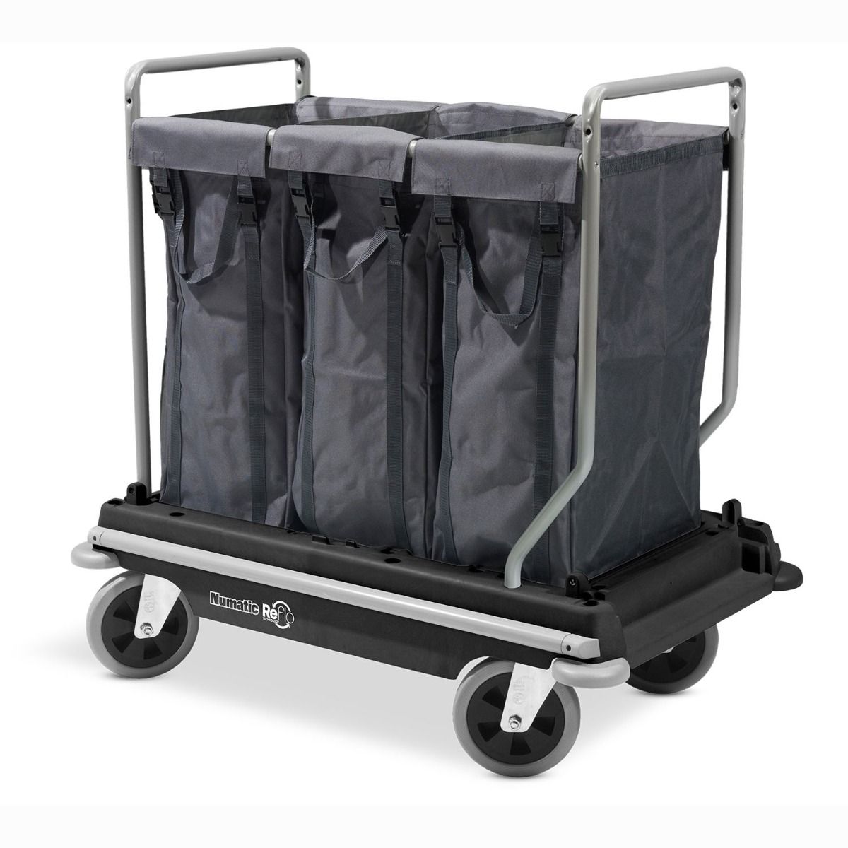 Mobiele waszakwagen met een sterke basis van Structofoam en vier grote zwenkwielen. Het metalen Nutex buizenframe biedt plaats aan verschillende soorten waszakken. Dit model heeft drie waszakken met een inhoud van 100 liter.