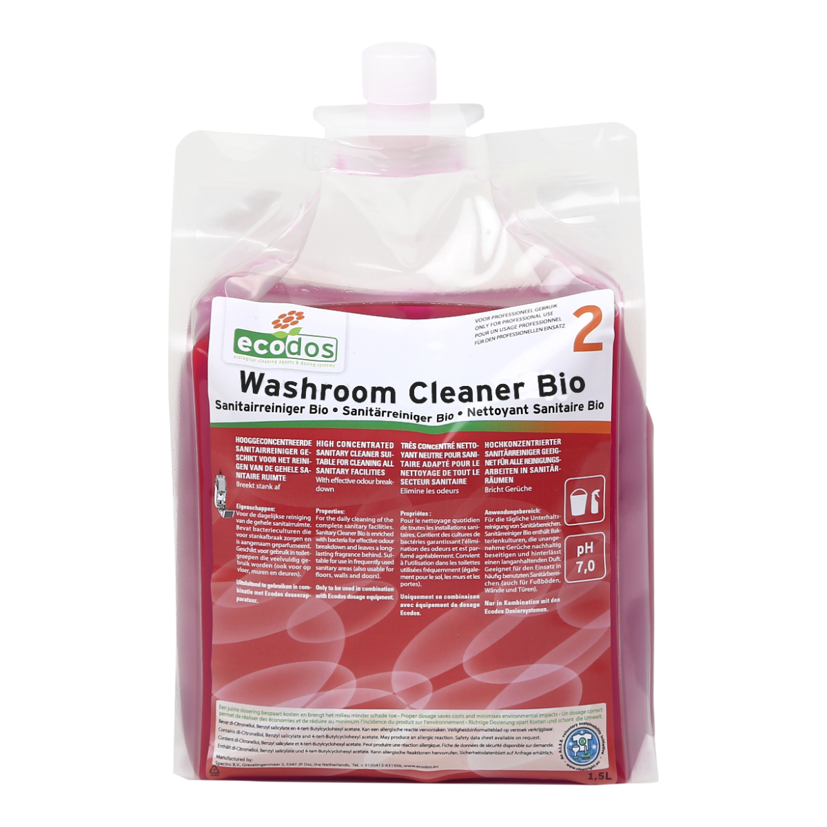 Sanitairreiniger Bio is geschikt voor alle waterbestendige oppervlaktes in de sanitaire ruimte zoals wasbakken, toiletten, urinoirs, tegels (wanden en vloeren) en deuren. Specifiek bedoeld voor toiletgroepen die veelvuldig gebruikt worden en last hebben van stank. Het product wordt onwerkzaam i.c.m. desinfectiemiddelen.