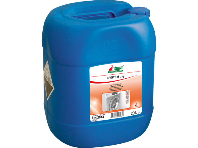 SYSTEM oxy maakt het linnen helder wit, dankzij de efficiëntie bij hoge temperatuur van de formule op basis van waterstofperoxide.