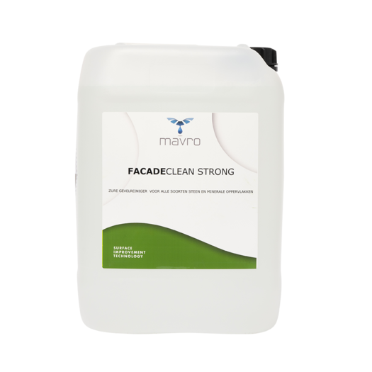 Facadeclean Strong is een vloeibare zure gevelreiniger op basis van fluorwaterstofzuur (HF) en fosforzuur.Het heeft een zeer krachtige werking en is toepasbaar op zwaar en extreem vervuilde minerale ondergronden en verwijdert effectief alle veelvoorkomende gevelvervuilingen.