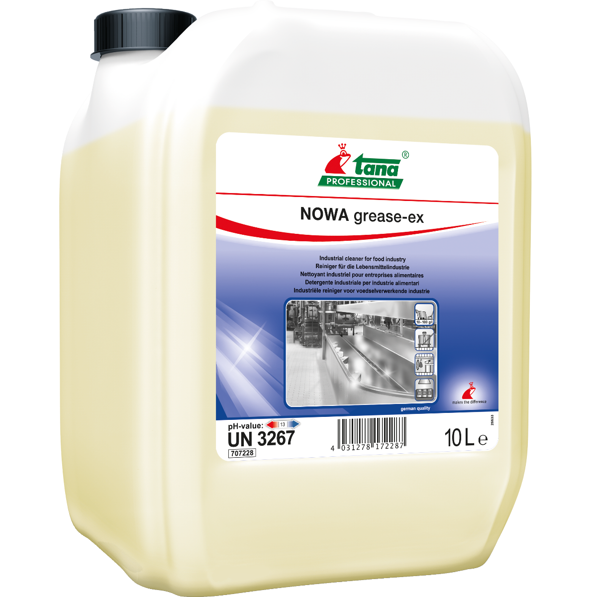 NOWA grease-ex is een krachtige ontvetter, die oliën en vet van mineralel, plantaardige en dierlijke oorsprong effectief oplost.