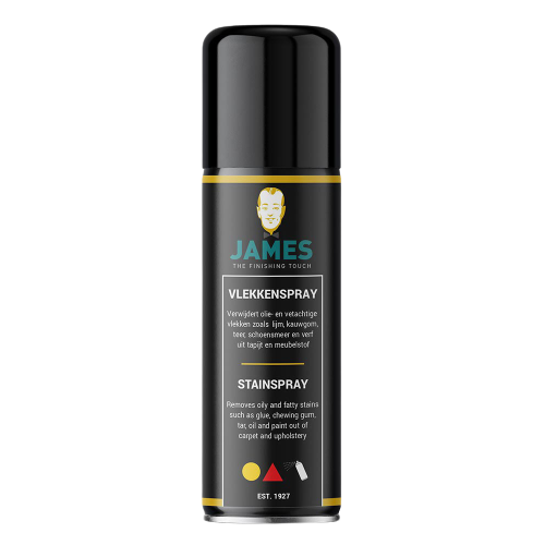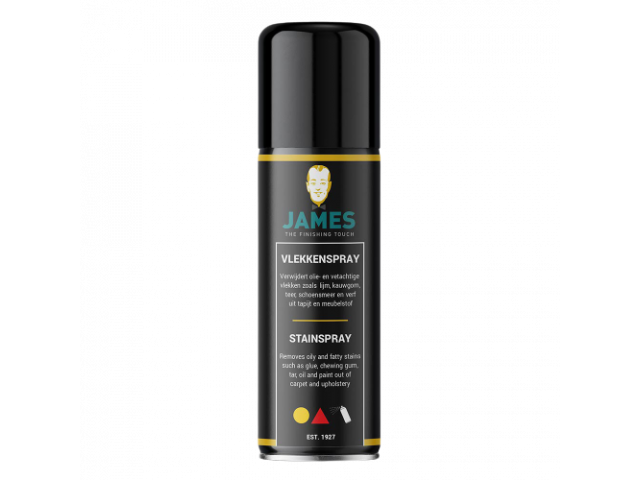 James Vlekkenspray verwijdert o.a. lijm, kauwgom, teer, schoensmeer, en verf uit tapijt en meubelstof. Het is geschikt voor alle materialen, zowel natuurlijk (zoals wol) als synthetisch. Ook heel handig als je olie in je gordijn hebt.