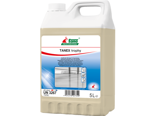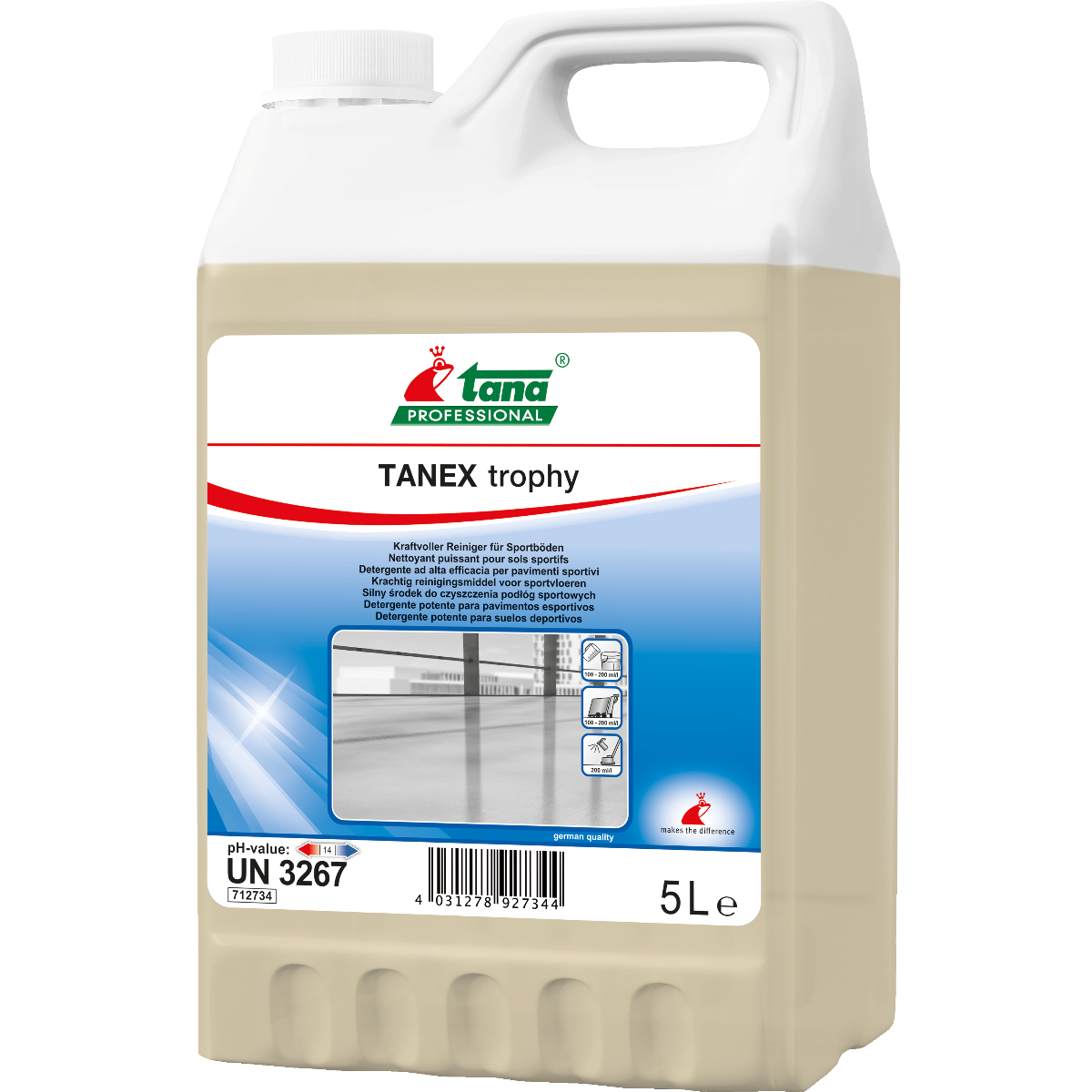 TANEX trophy is een krachtig detergent met een speciale formule om specifieke vlekken in gymzalen te verwijderen op alkaliën resistente oppervlakken. Het is uiterst efficiënt bij harsresten en werkt snel bij zwarte strepen.
