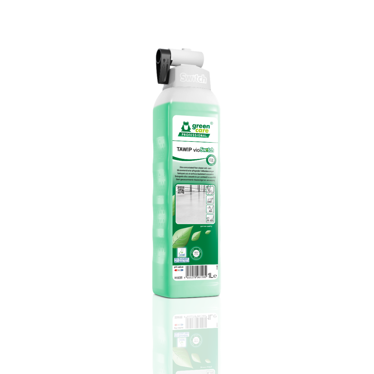 TAWIP vioSwitch sterk geconcentreerde vloerreiniger en -verzorging. De natuurlijke kokoszeep in de formule beschermt vloeren tegen uitloging en laat een beschermende film achter met antistatische werking, waardoor het gevaar van uitglijden wordt verminderd in overeenstemming met DIN 18032-2.