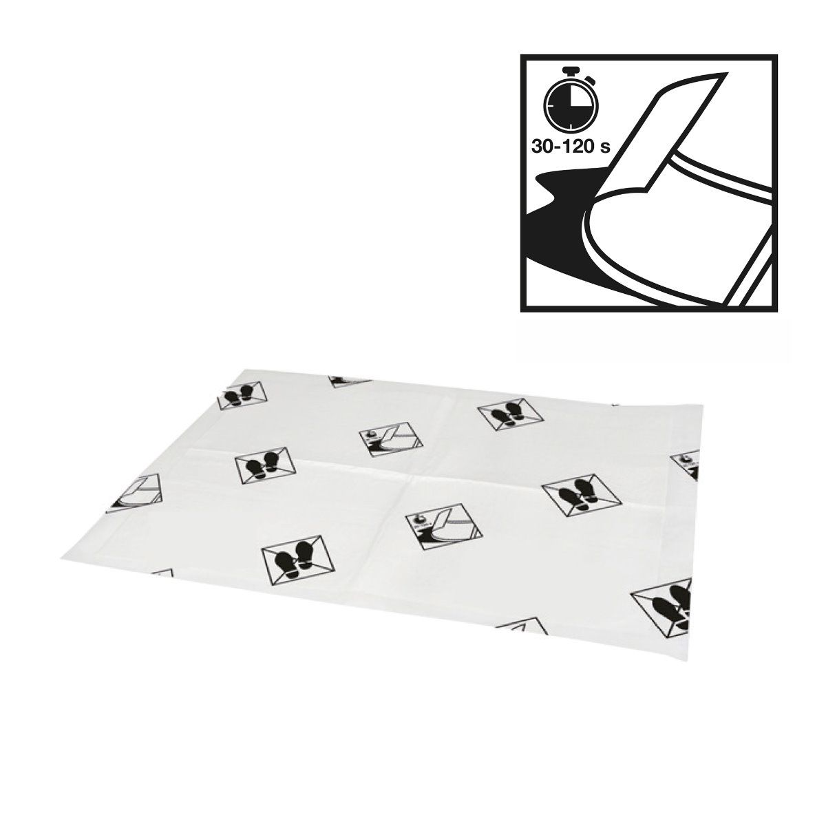 Absorbeert in 30-120 seconden tot 1200ml vloeistof, afhankelijk van de viscositeit.